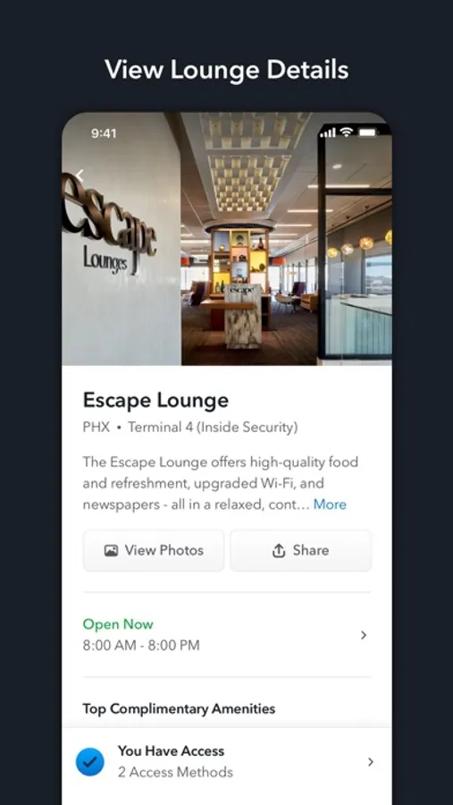 Airport lounge information all in one place - View hours, location, ratings, reviews, photos, amenities, access requirements, and guest privileges for each lounge.