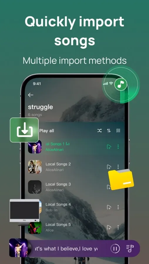 Import your favorite music and play it anywhere, anytime! Offline listening, no limits!
