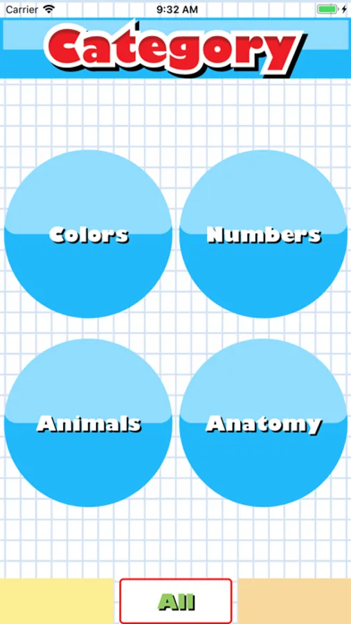 Current categories are: Numbers, Colors, Animals, Anatomy, and All (meaning numbers, colors, anatomy, and animals).