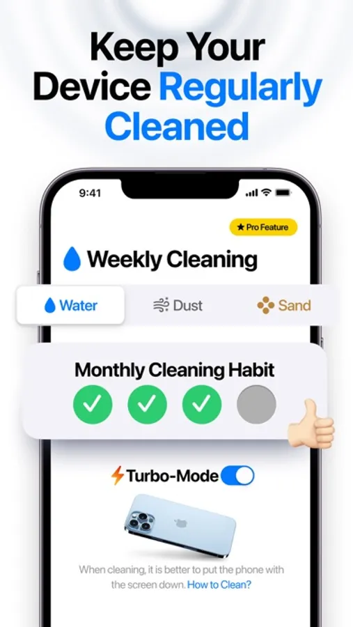 Over time, speakers may lose clarity due to trapped moisture, dust, or sand - especially after exposure to water or outdoor environments like the beach. Our high-frequency sound wave tool emits targeted signals designed to help dislodge water droplets, fine particles, or debris, which may restore clearer sound. This method is commonly used to clean earbuds and phones affected by water or clogged with dust. Results may vary by device, but it’s a fast and simple step that can make a noticeable difference. You can also activate monthly cleaning reminders - a helpful habit to extend your speaker’s lifespan and performance.