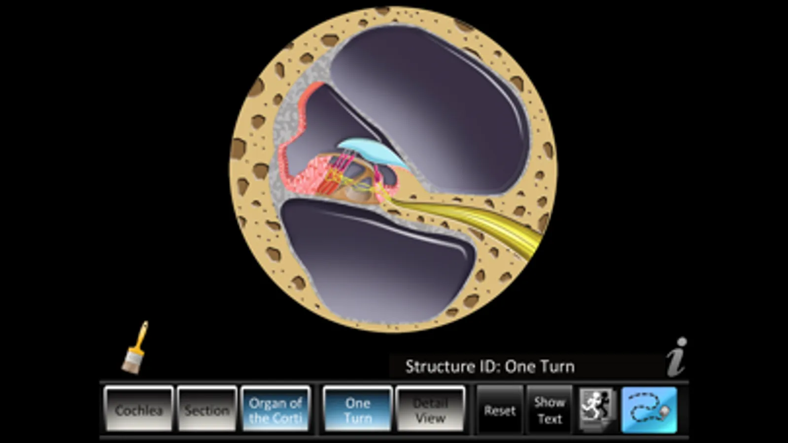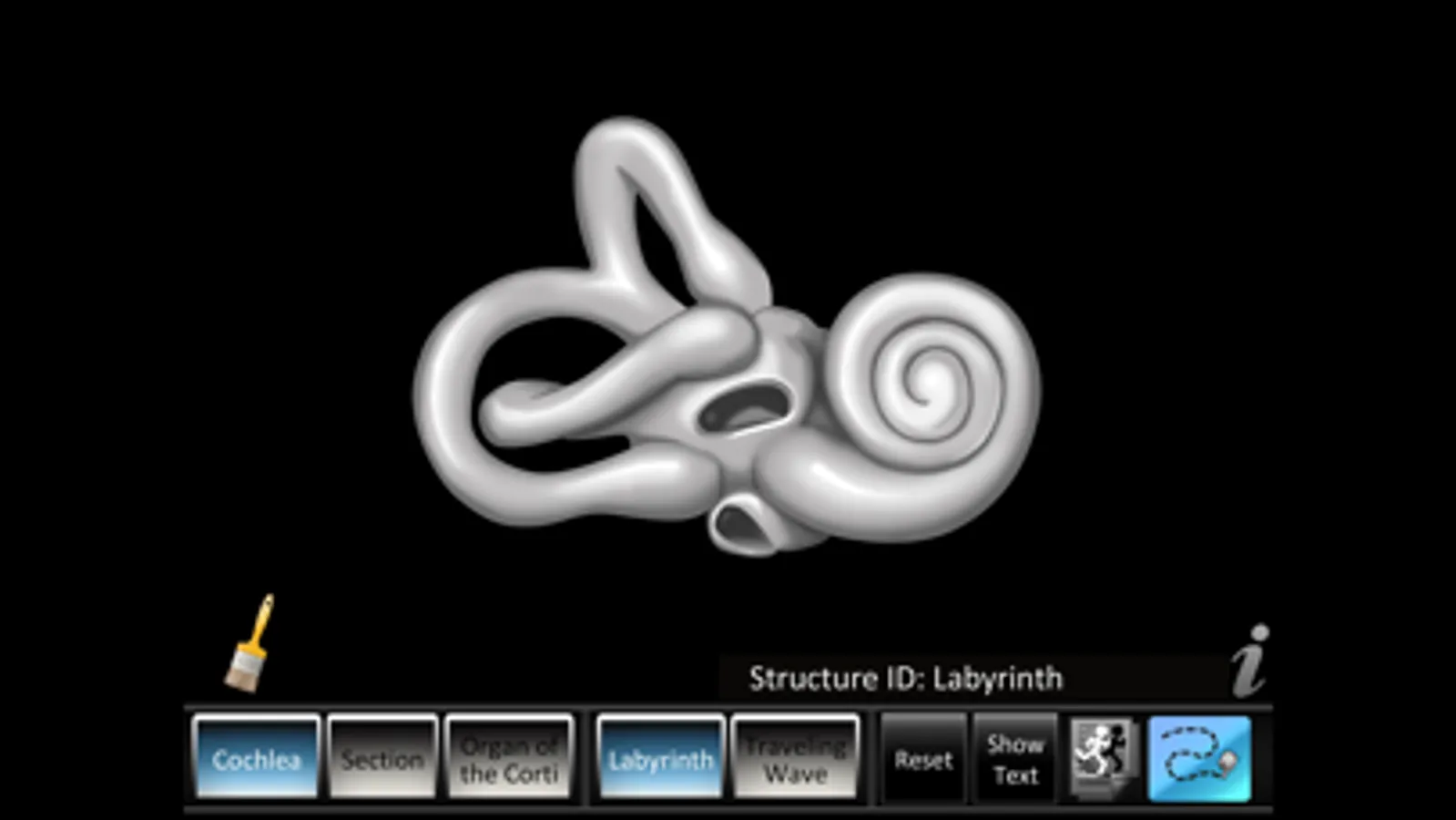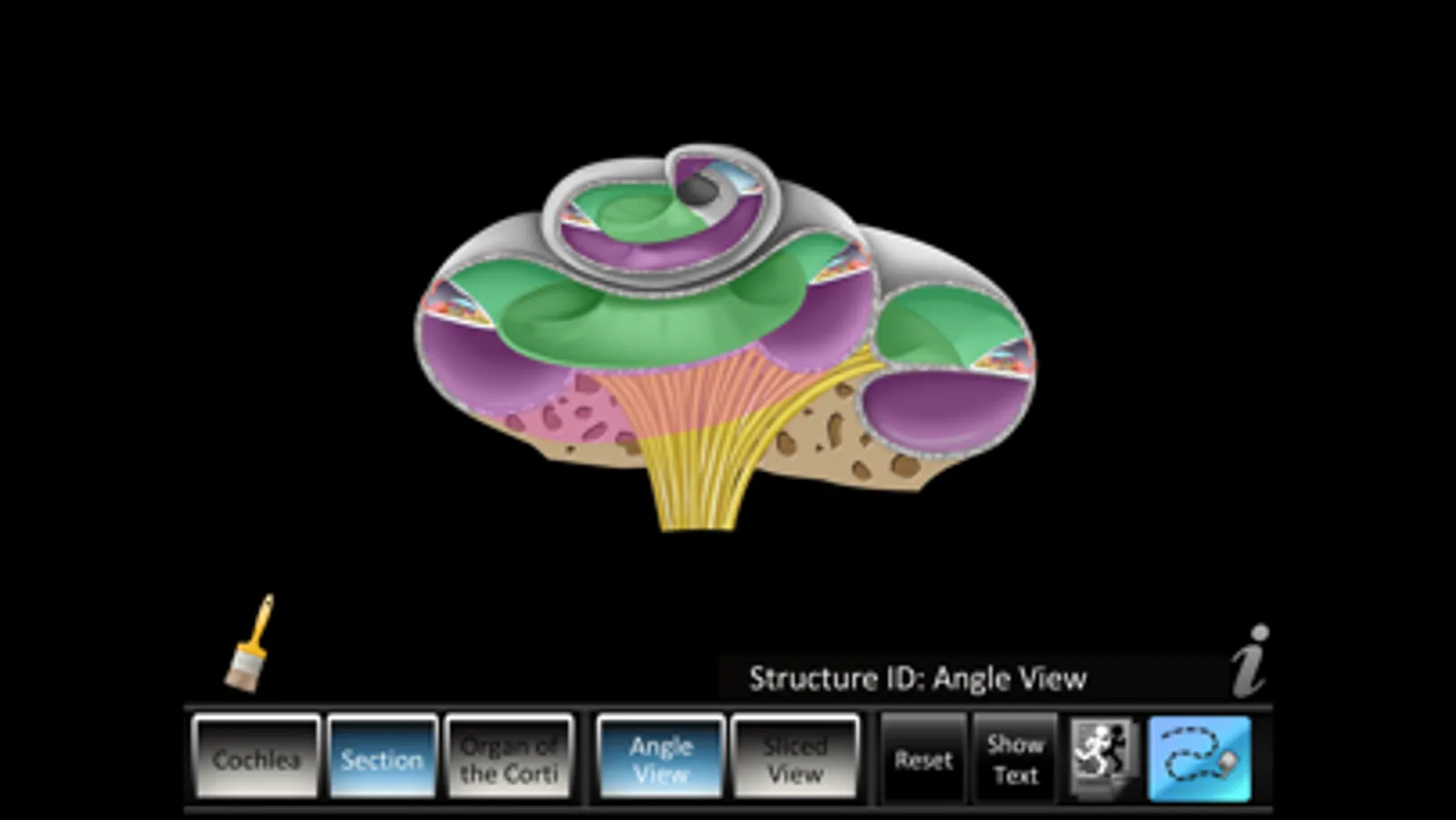 • Structure ID for the labyrinth and traveling wave, cochlea angled and sliced view and organ of corti one turn and detailed view. As each part is touched, the part highlights and the part name and description text changes. Description text shows or hides on demand.
