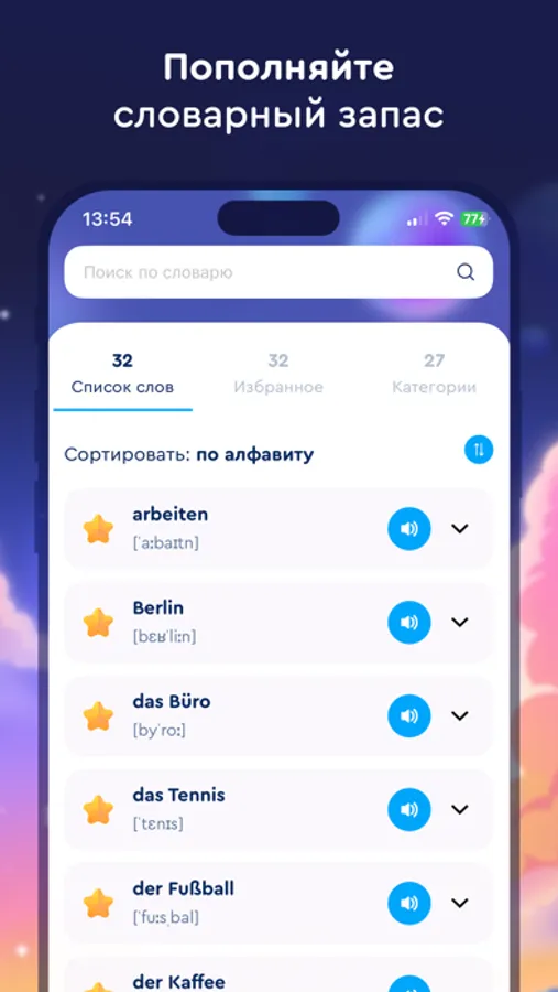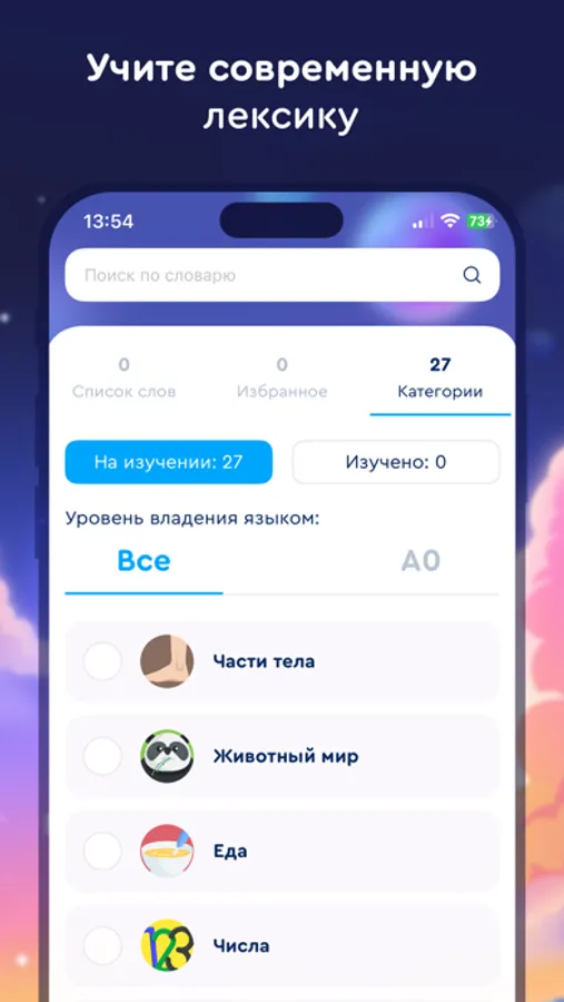 Внутри программы предусмотрено изучение новых слов, включая лексику по категориям, таким как еда, путешествия, работа, семья и другие темы. Вы можете добавлять незнакомые и сложные слова в свой личный словарь и отрабатывать новую лексику в любой момент!