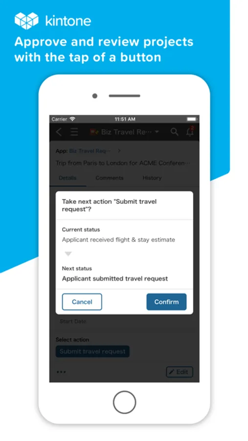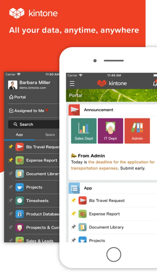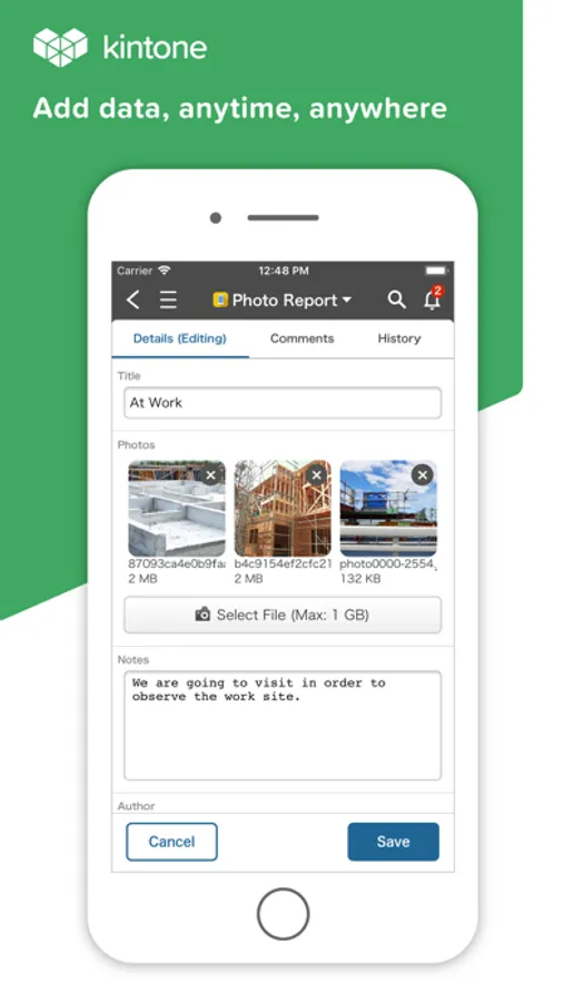 Kintone mobile helps you to work smoothly even outside the office, such as sending sales opportunity reports onsite and reporting statuses with photographs of stores and construction sites attached.