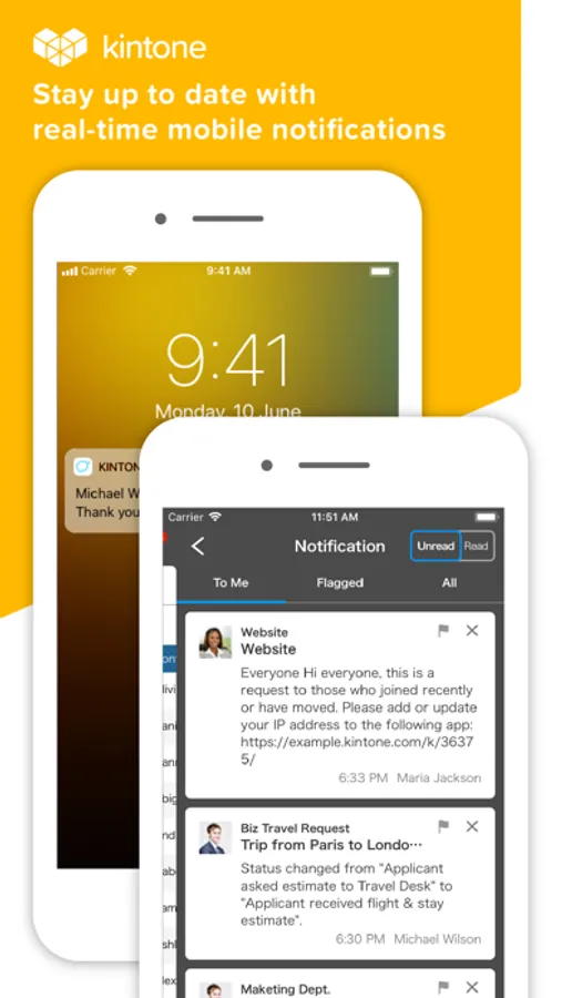 You also receive push notifications including "To Me" and updated information wherever you are, so that you neither miss the information you must confirm nor interfere with team's work.