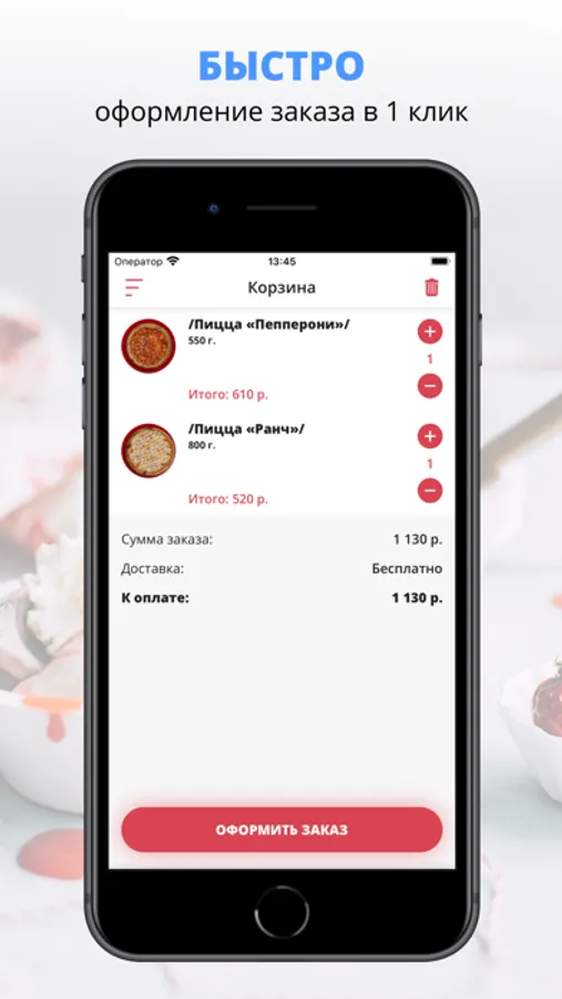 Мгновенный заказ — добавляйте блюда в корзину за пару кликов, а оплачивайте картой, наличными или онлайн.