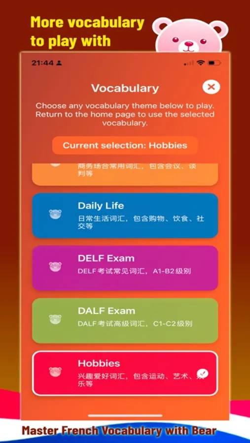 Join BearBeby, your friendly language buddy, on a playful journey through Chinese vocabulary. Whether you're a complete beginner or just brushing up on essential words, BearBeby Chinese makes learning fun, intuitive, and rewarding.