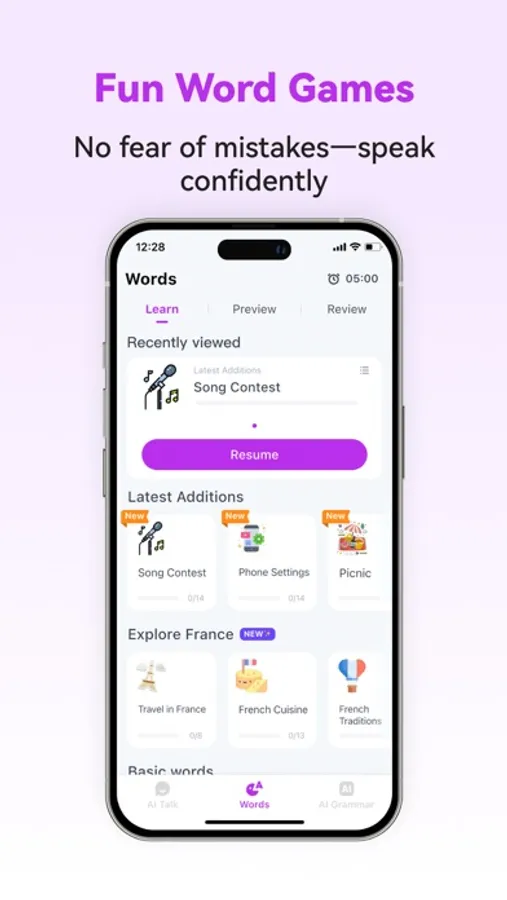 >>Gamified Vocabulary Practice: Learn and review words through fun games that boost retention