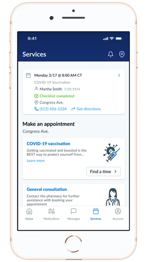 Pharmacy services: Browse a list of healthcare services offered by your pharmacy, such as vaccinations, point-of-care testing, and health consultations. Use this section to explore what's available and find information to help plan your visit.