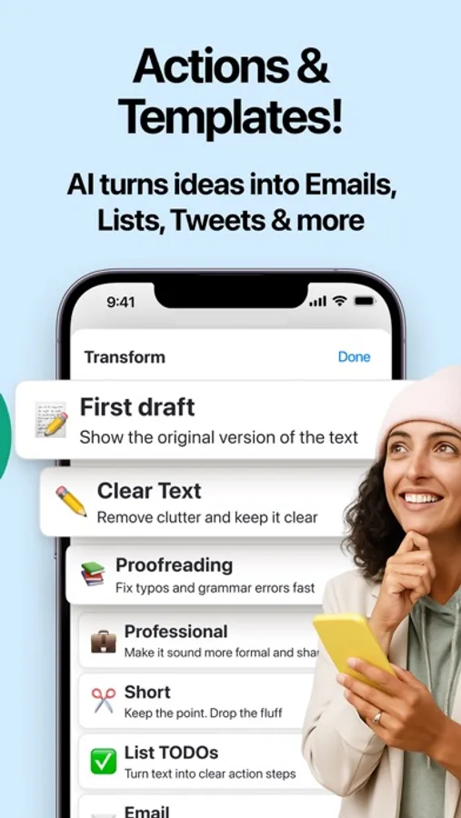 ● Style Customization: Instantly convert your notes into to-do lists, emails, bullet points, or short-form summaries.
