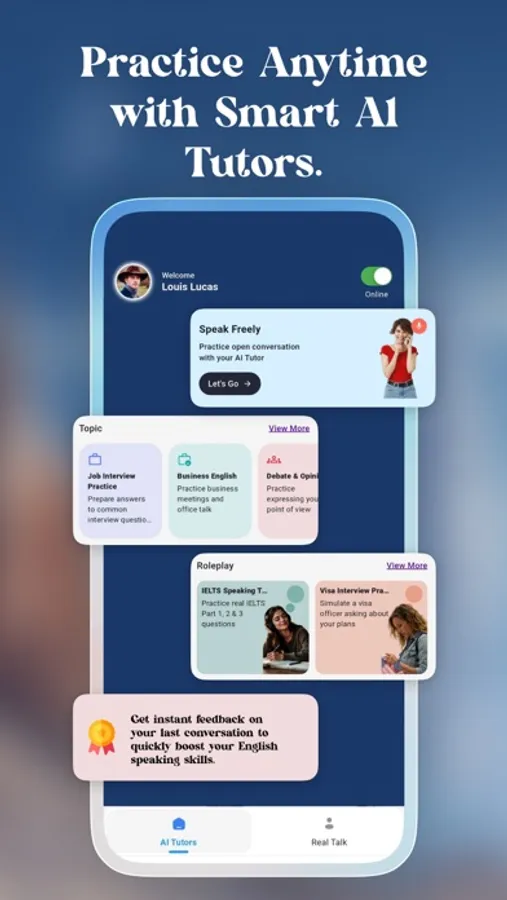 Want to speak fluent English faster? SpeakOnline.ai is the only language app that combines smart AI tutor sessions with real-time conversations with real people around the world.