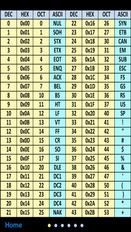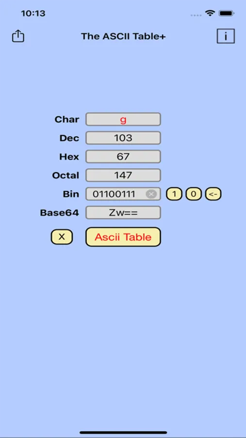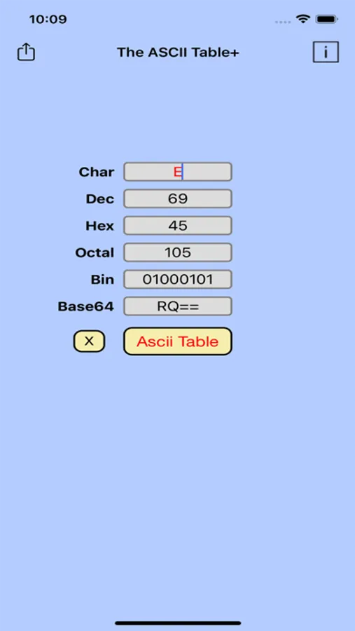 This App displays the complete Ascii table. Futhermore it converts a single Ascii character into corresponding Decimal, Hexadecimal, Octal, Binary and Base64 value.