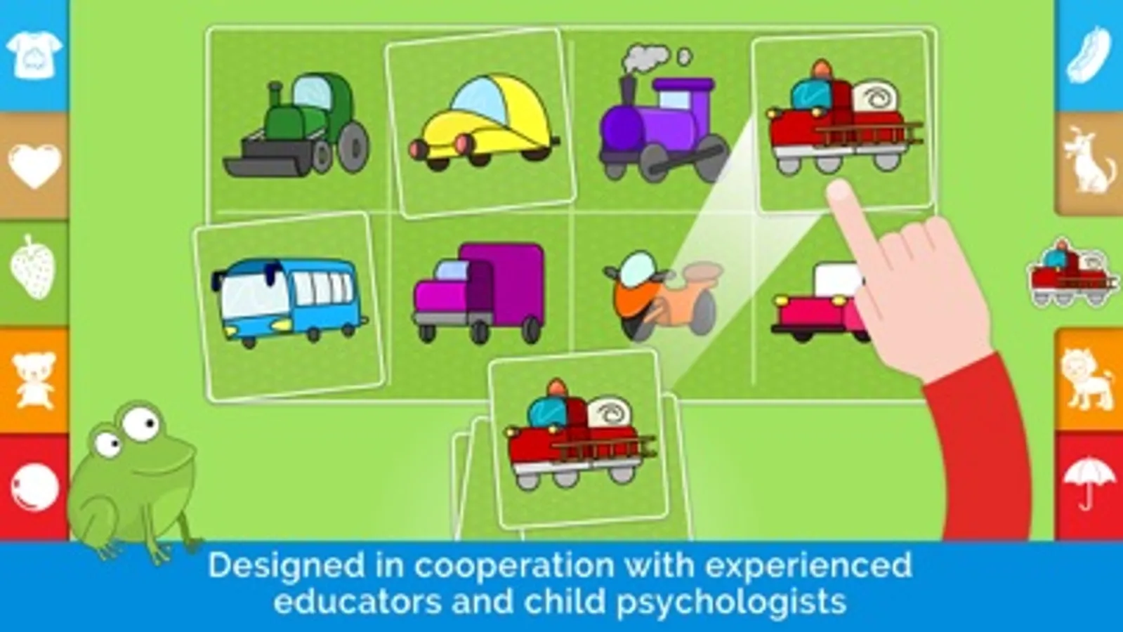 A series of three pair matching games. The game challenges the child to match pairs, initially based on visual aspects alone and in more advanced screens based on logic and understanding of card content.