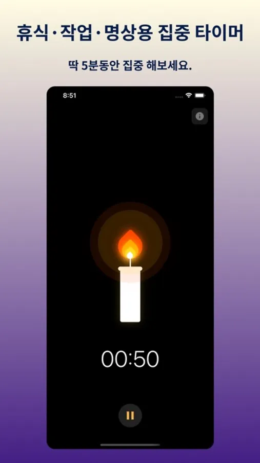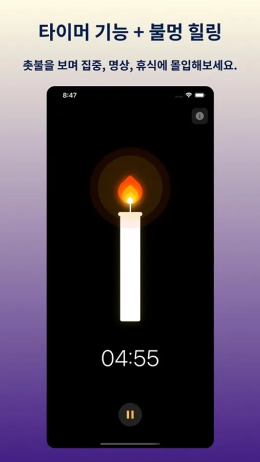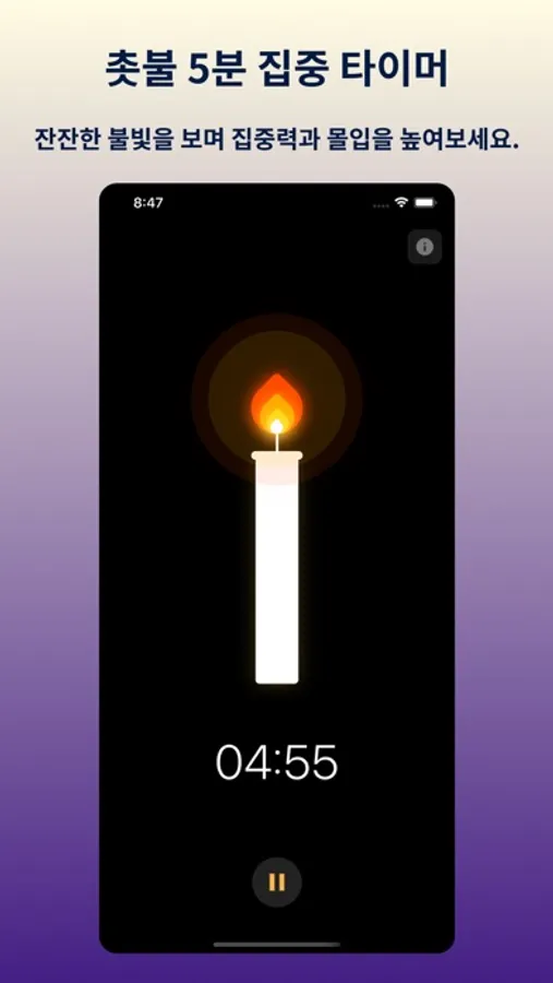 하루에 단 5분, 불빛을 바라보는 것만으로도 깊은 휴식을 경험할 수 있습니다. 이 앱은 잔잔하게 타오르는 촛불 애니메이션과 함께 5분 타이머를 제공하여, 바쁜 일상 속에서도 짧고 강력한 멈춤을 만들어줍니다. 복잡한 생각을 내려놓고, 아무것도 하지 않아도 되는 시간. 눈앞의 촛불에 집중하는 동안 당신의 뇌는 진정되고, 마음은 다시 안정감을 되찾게 됩니다. 명상이 어렵거나 생각이 너무 많을 때, 이 앱은 가장 쉬운 방식으로 당신을 휴식의 중심으로 이끌어줍니다. 지금 바로, 타오르는 불빛을 따라 나만의 쉼표를 만들어보세요.