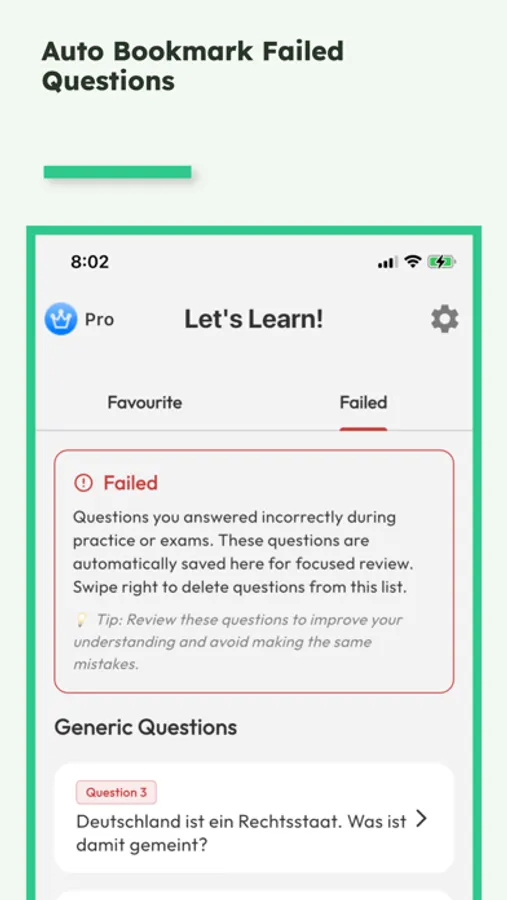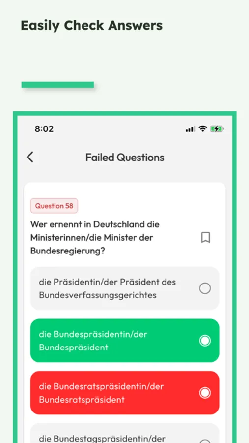 - Progress Tracking: Track your learning progress with detailed stats and history. The app saves your past test results, highlights questions you answered wrong, and lets you bookmark tricky questions for review later. You’ll always know how exam-ready you are.