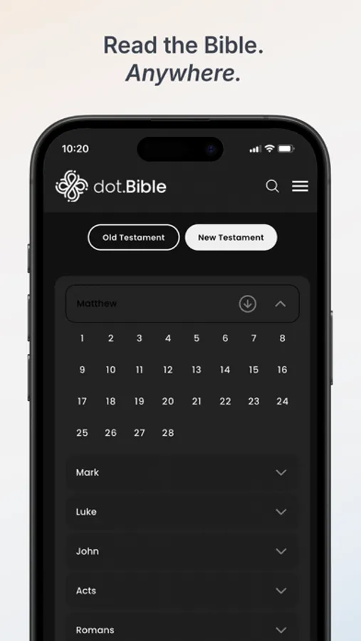 Dot Bible is designed with clarity and beauty in mind. It allows users to easily navigate, toggle between views, and focus fully on God’s Word. It also includes support for dark mode and smooth transitions.