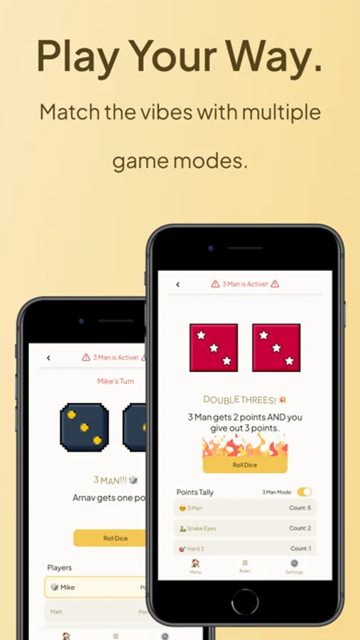 Meet the classic 3 Man dice game, now in an app that handles all the chaos for you. No more arguments over who the 3 Man is or what those sneaky dice really mean. We've got the rules covered so you can focus on the important stuff: having a blast.
