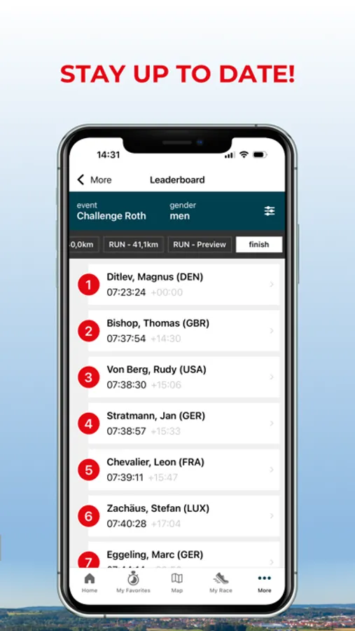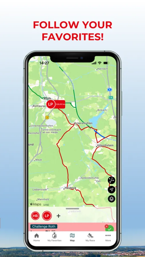 With the DATEV Challenge Roth app participants, spectators, volunteers and triathlon fans always stay up to date. The app provides live tracking of athletes, real-time race results, and important information about the event all year long.