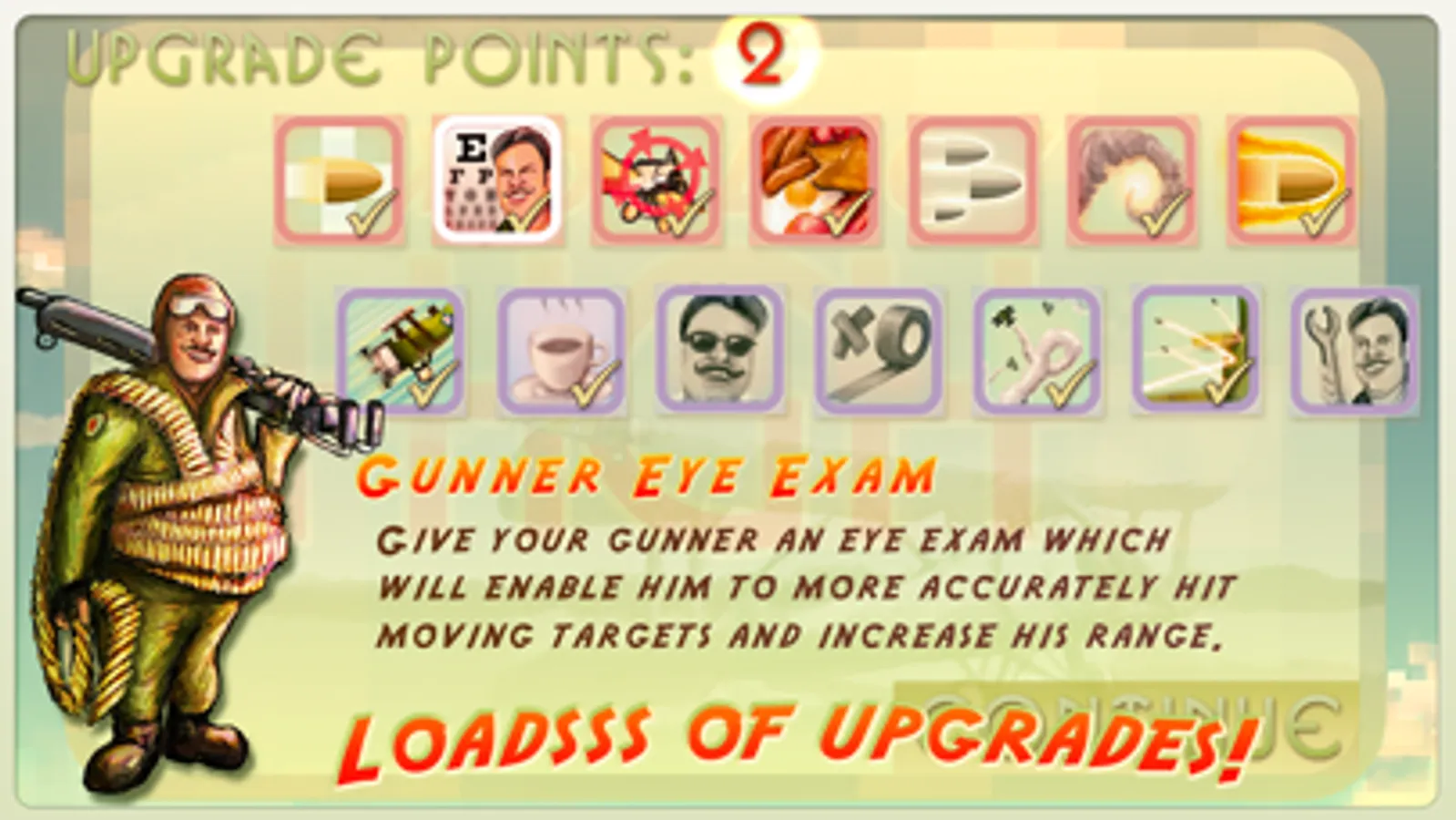 Earn upgrade points after each wave to spend on 14 different aircraft upgrades. From titanium armour and rockets to eye exams and a full English breakfast. Yes you read that correctly.