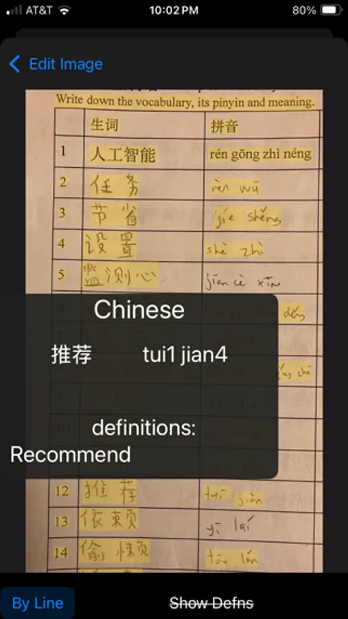 Upon taking a photo and pressing the "Translate" button, the Vision framework automatically searches the photo for texts and retrieves the bounding rectangles that encapsulate those texts. Upon clicking the rectangle, you will find the pronunciations and definitions for those words. At the bottom, you can decide on whether to retrieve by characters or by lines (separated by spaces). If you are translating from Chinese, you can choose the option "Use Definition" to use the dictionary definitions.