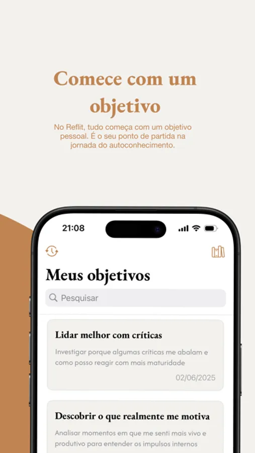 O Reflit é um app de reflexões e autoconhecimento que ajuda você a acompanhar sua jornada pessoal por meio de objetivos conscientes. Nele, você pode criar metas como “entender por que ajo de forma diferente com certas pessoas” e adicionar reflexões livres ao longo do tempo, aprofundando sua compreensão sobre si mesmo. Quando sentir que completou esse processo, é possível encerrar o ciclo — mantendo todo o histórico salvo para consultas futuras.