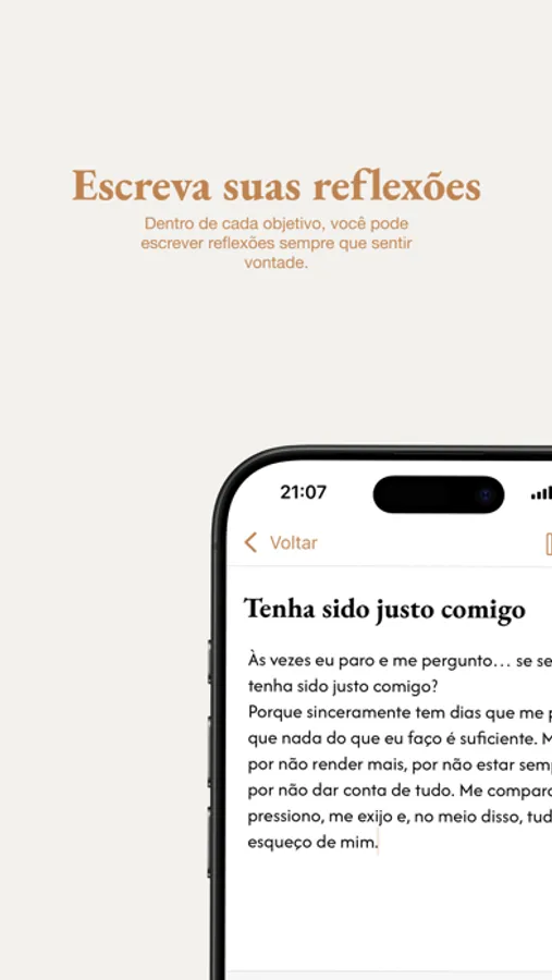 O aplicativo também oferece temas sugeridos com base em categorias como autocompaixão, tempo, amor-próprio, entre outras, ajudando a inspirar sua escrita e ampliar sua percepção. Além disso, você pode buscar reflexões anteriores e observar como evoluiu ao longo do tempo.