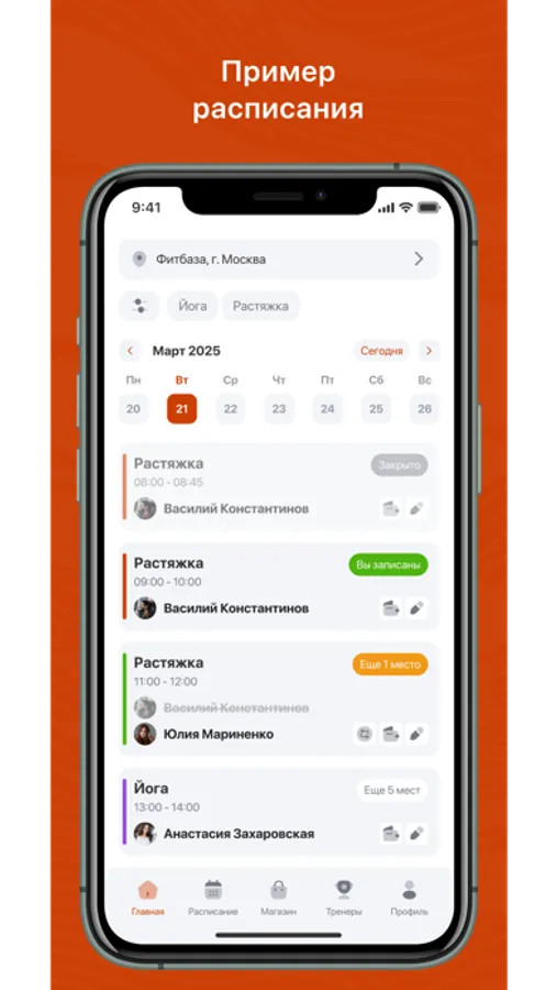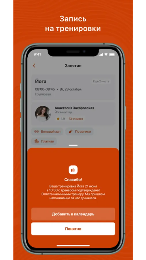 - Получать PUSH-уведомления о предстоящей тренировке за 3 часа;