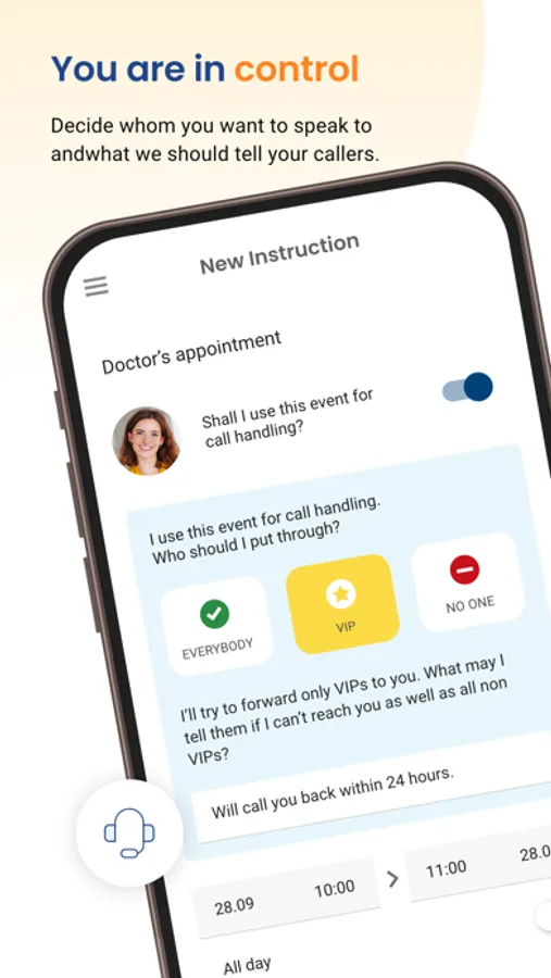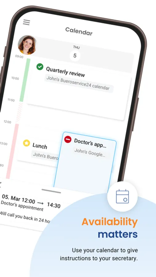 eburo is a virtual secretary service for small and medium companies. We take your calls 24/7, 365 days a year. Via the eburo app, you can set up how your secretary should handle your calls on the go. Leave directions quickly, schedule call instructions on your agenda, or adjust your availability even on short notice.