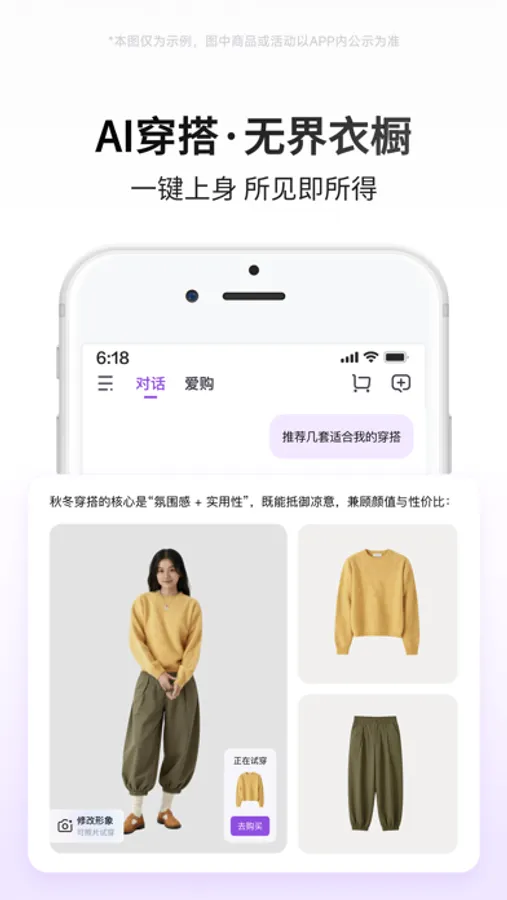 不知道穿什么好?点击“AI穿搭”,你的私人造型师,给你穿搭灵感,同时支持虚拟试穿,一键看到真实上身效果,理想穿搭,照进现实。