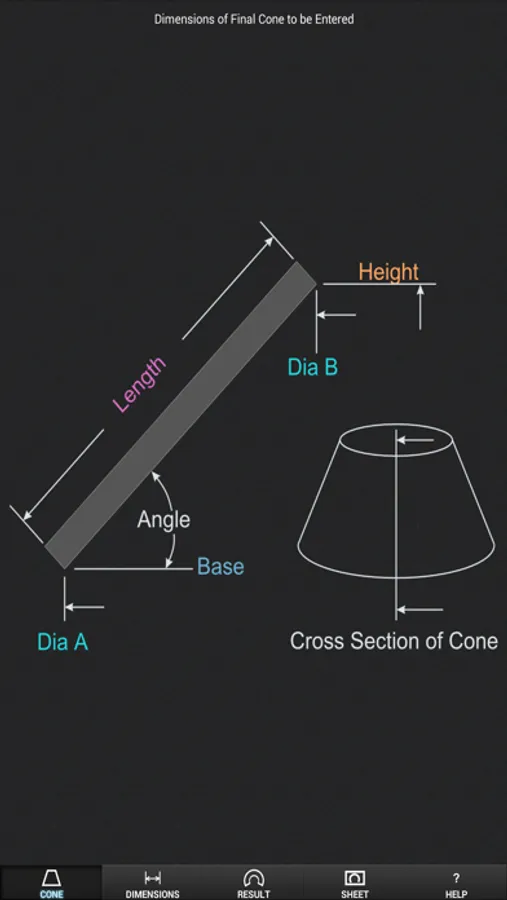 Enter the desired dimensions of the finished cone shape. You only need to enter one diameter and two other of the five possible dimensions of the final cone. The other dimensions will be calculated from these.