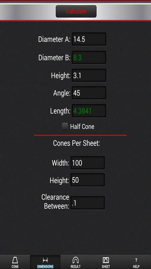 A drawing of the flat pattern with dimensions is produced. Also calculates number of cones that can be cut from a sheet size.