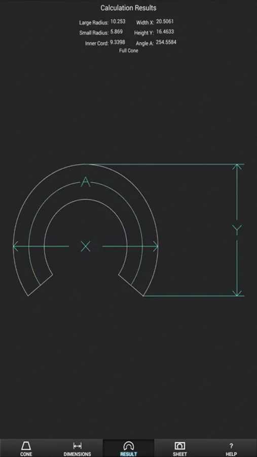 A calculator for the flat pattern dimensions of a cone. For creating a cone from sheet metal or any flat material.