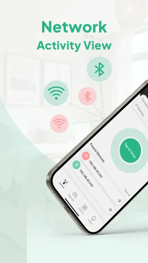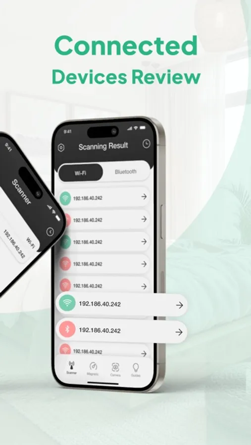 Start by scanning for nearby Wi-Fi and Bluetooth devices. The app instantly reveals what's connected or broadcasting in your area. This can help you detect unfamiliar smart devices, find trackers or active sensors, or simply understand how many gadgets are around you. It’s especially useful in short-term rentals, shared apartments, or any public environment where privacy can’t be guaranteed.