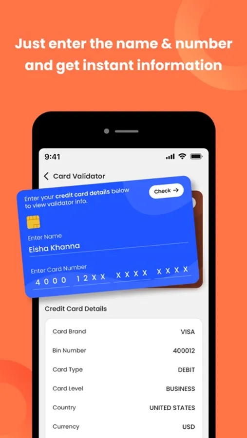 Validate credit cards with ease using the powerful and secure Credit Card Validator app! Whether you're a developer, QA tester, or simply curious about how card numbers work, this app lets you quickly verify and generate credit card numbers from major providers like 'Visa', 'MasterCard', 'Discover', 'JCB', and many more.