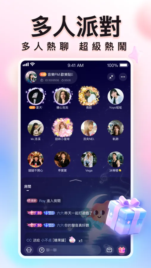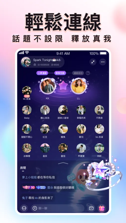 Multi-player audio room parties are available 24/7! You are welcomed to join without any burden! Unlimited entertainment is available -- singing, games, chatting, sharing and chilling with friends.