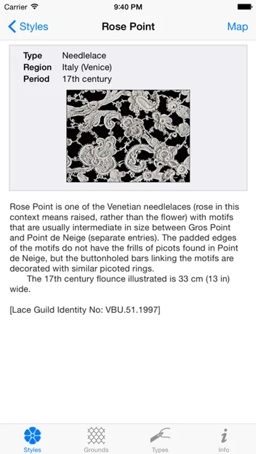 The distinguishing features of the styles are explained, and for each lace there is a photo of both a detail and of a whole piece. The laces are placed in their historical context, and maps are available showing the regions where they were produced.