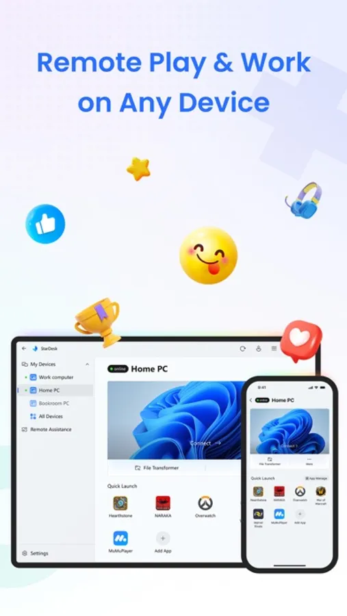 StarDesk delivers ultra-low-latency remote desktop and secure remote access, letting you control your PC from iOS, iPadOS, Mac, Windows, other mobile device or another PC—with remote wake, fast file transfer, smooth screen share, and responsive 4K streaming for both work and remote PC gaming.
