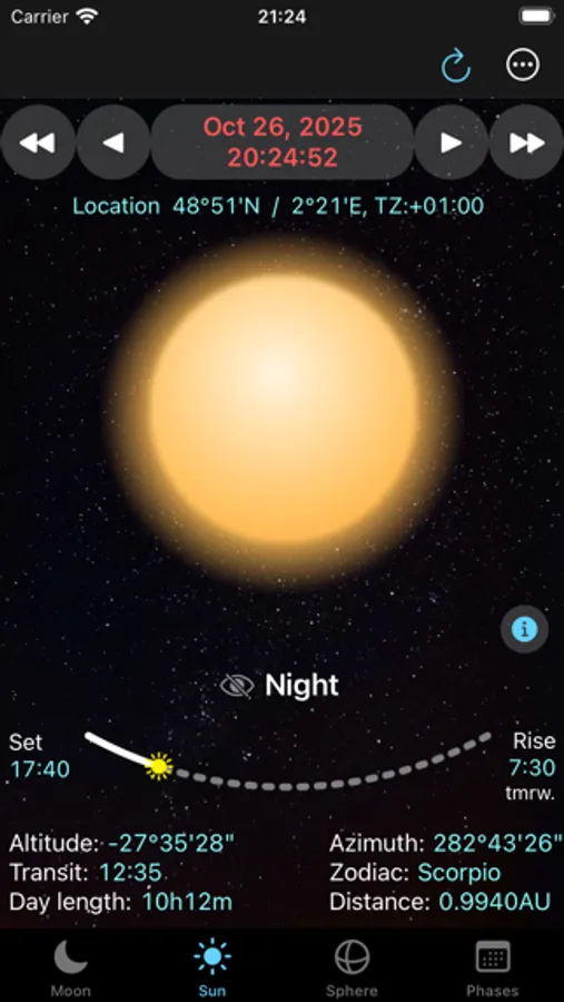 Explore the sky like never before with Moon & Sun tracker, an astronomical app that helps you stay connected with the movements of the Moon and the Sun.