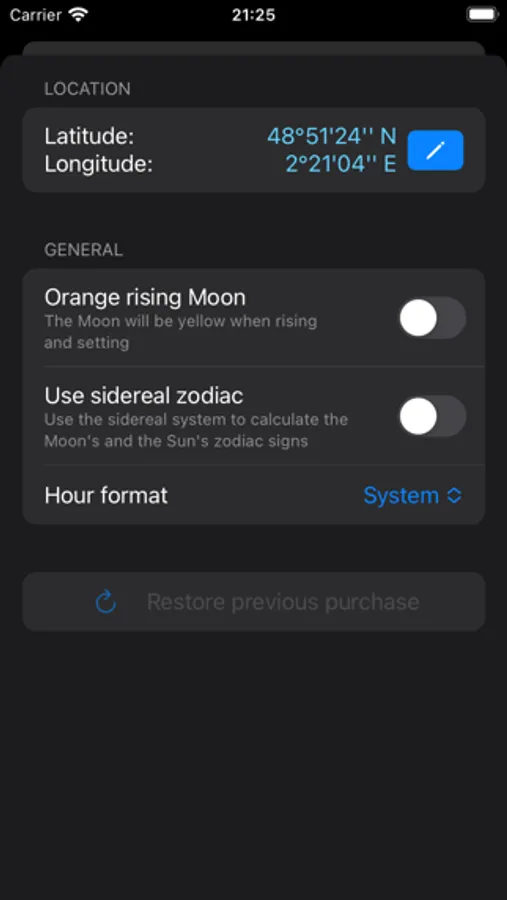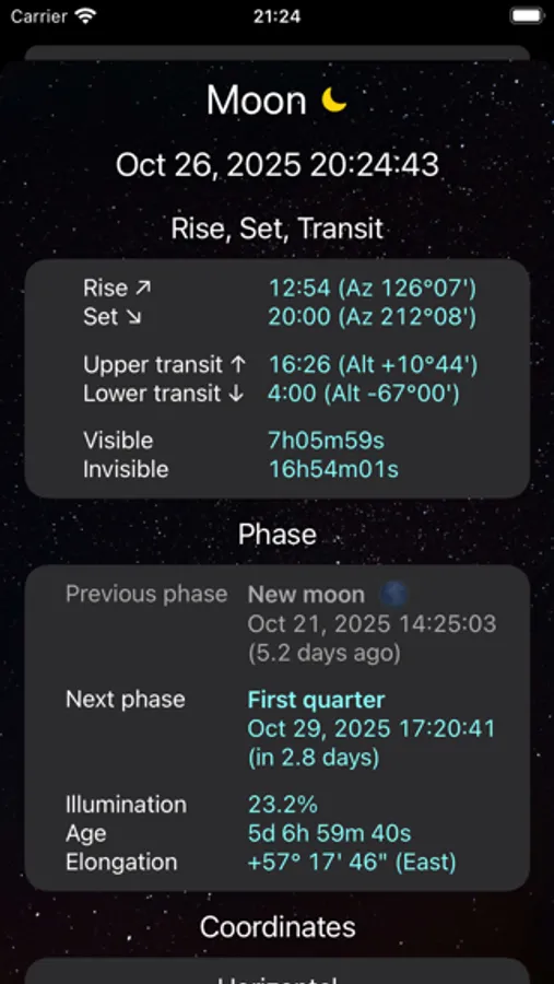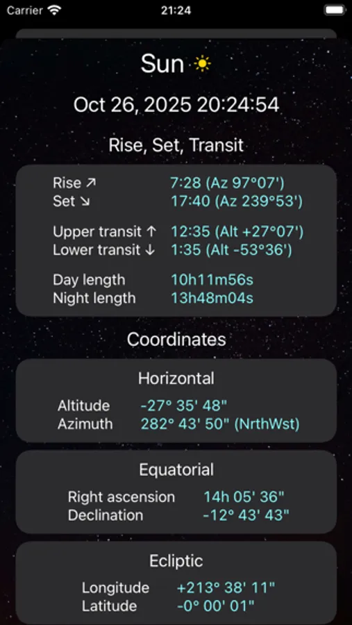 - Sun and Moon Coordinates: View current azimuth, altitude, and declination — or check coordinates for any selected date.
