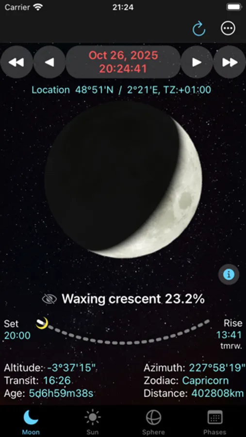 - Moonrise & Moonset: Know exactly when the Moon appears and disappears from the sky.