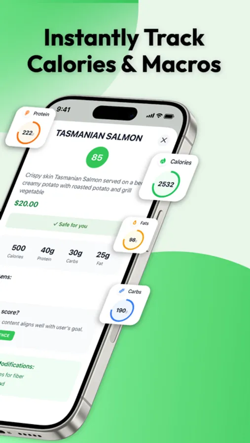 - Scan any restaurant menu and see calories, macros, and health scores for every item.