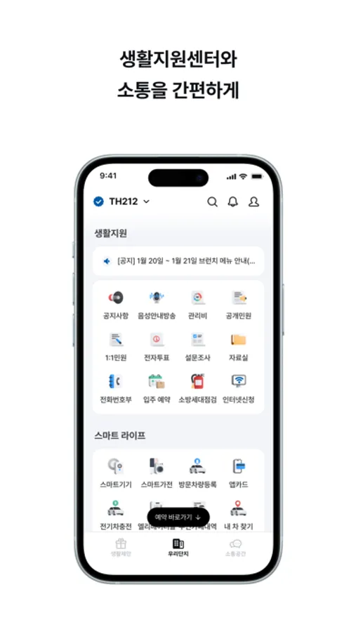 TH212 를 사용하는 입주민들은 거주하는 아파트의 모든 서비스가 담긴 All-in-One 주거 통합 서비스를 경험하게 됩니다.