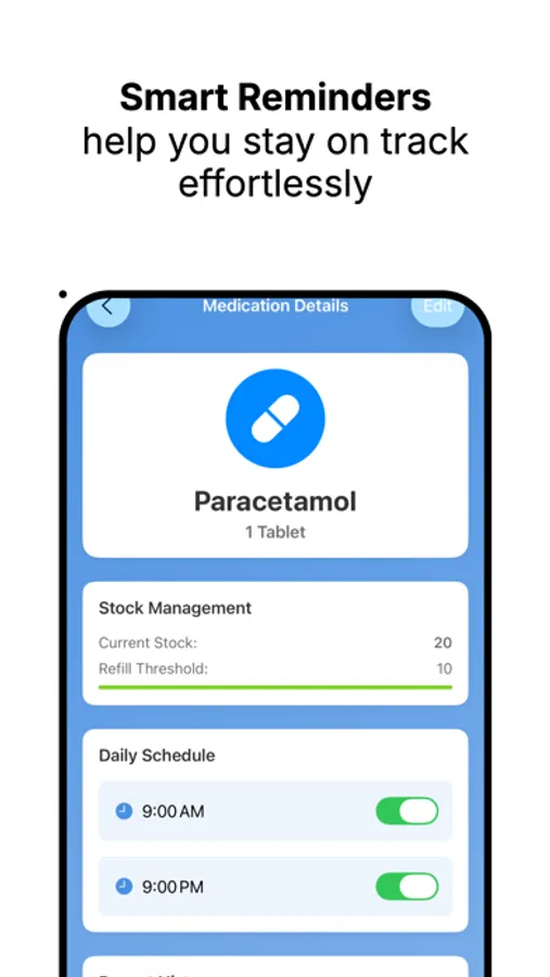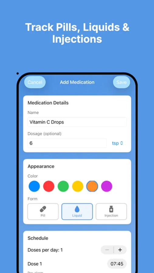 Effortlessly track pills, liquids, injections, and supplements. Set multiple daily doses with custom times, and get reliable reminders - including pre-alarms - to help you prepare in advance.