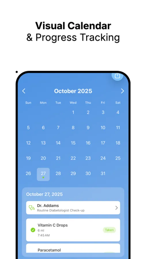 View your complete health routine in a clean, visual calendar. Track your journey over time, review past doses and appointments, and stay informed about your overall medication adherence.