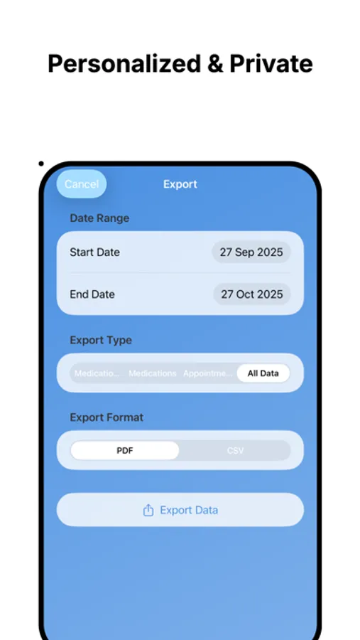 Customize your experience with color-coded medication cards, icons, and personal notes. Create user profiles, choose your preferred language, and enjoy a smooth, privacy-focused experience with all data securely stored on your device.