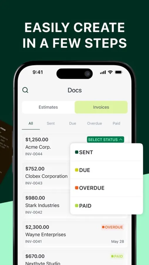 • Docs — Manage all your invoices and estimates in one place. Quickly sort documents by status, date, client, or amount. Easily switch between the Invoices and Estimates tabs to keep everything neat and accessible. Stay on top of your financial documents without any hassle.