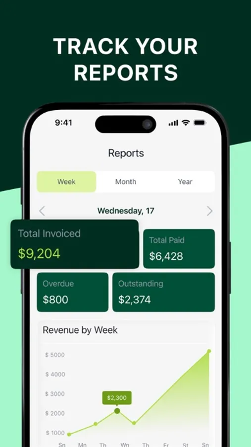 • Reports — Gain valuable insights into your income and business performance. Analyze your revenue by Week, Month, or Year. Track amounts, invoice statuses, and visualize your data with easy-to-read charts. Make smarter financial decisions at a glance.