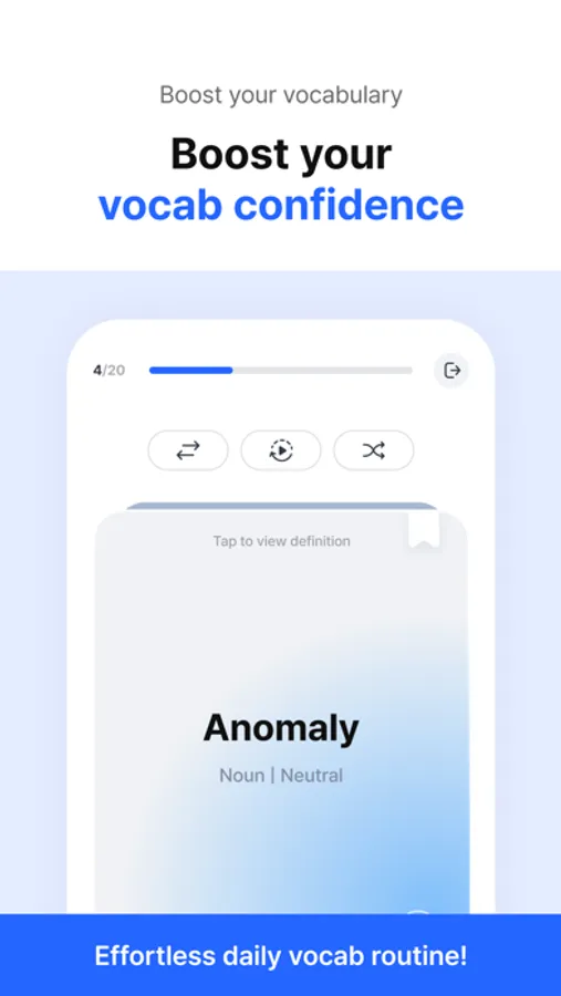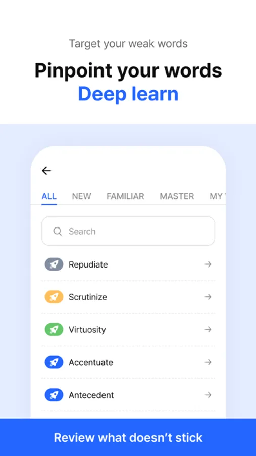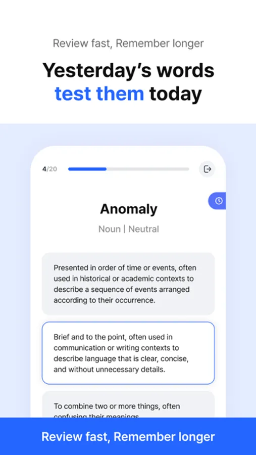 Words learned the previous day appear in the following day’s Daily Test, creating a natural Learn → Test → Review loop.
