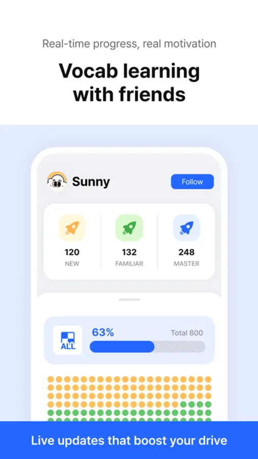 Your “NEW,” “FAMILIAR,” and “MASTER” word ratios are visualized through a clear Knowledge Map.