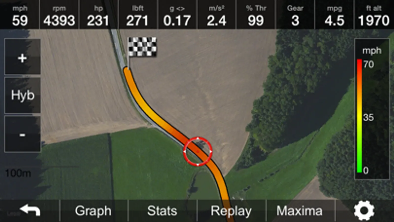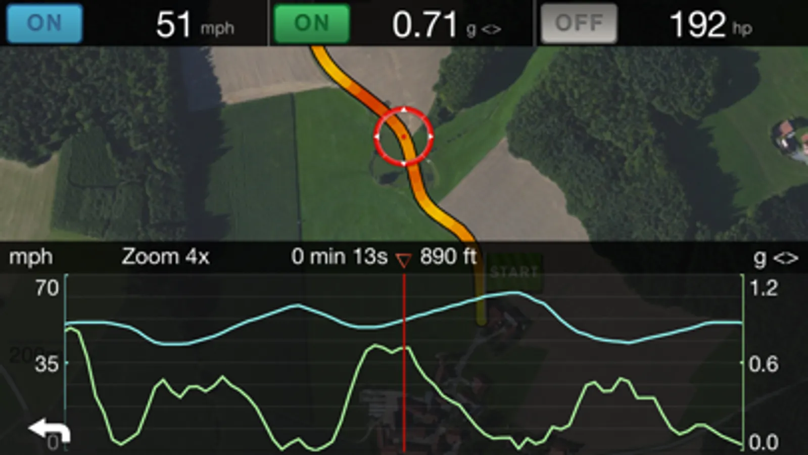 Shows lateral and linear acceleration with maximum value notifications