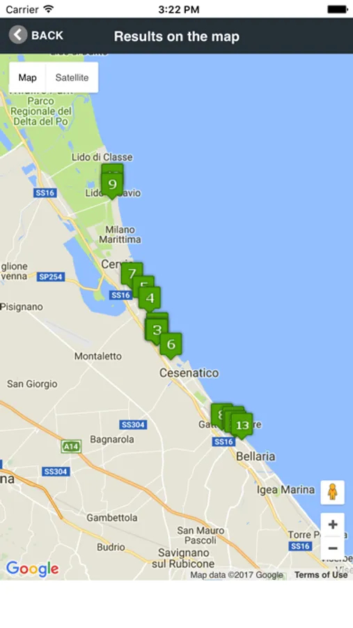 The results are shown in a list and it is also possible to display them all on the map to get an overall precise idea that will help you to find the sites chosen.